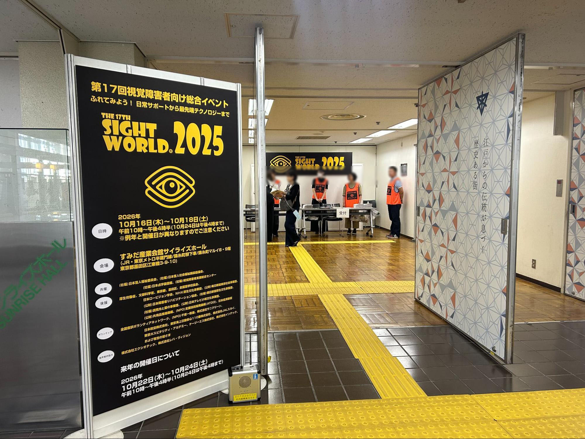 錦糸町駅南口から徒歩わずか3分という好立地。改札を出てまっすぐ歩けば会場に到着する距離ですが、改札付近、信号の前、建物の入口など、動線の随所にオレンジのベストを着たボランティアの方々が配置され、来場者が迷うことなくスムーズに到着できるよう、積極的に声掛けをされていました。